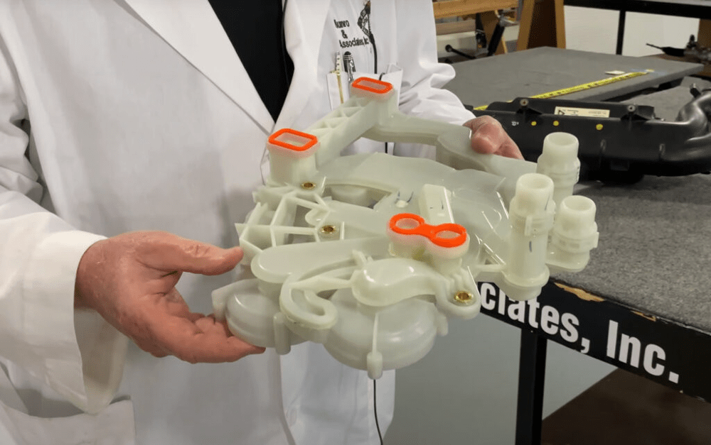 (Inside Tesla’s Octovalve – VASA) Figure: Munro & Associates holding the Model Y’s multi-port coolant manifold (the Octovalve’s orange-ringed ports interface with this manifold). The Octovalve assembly integrates numerous cooling/heating functions into a single unit.